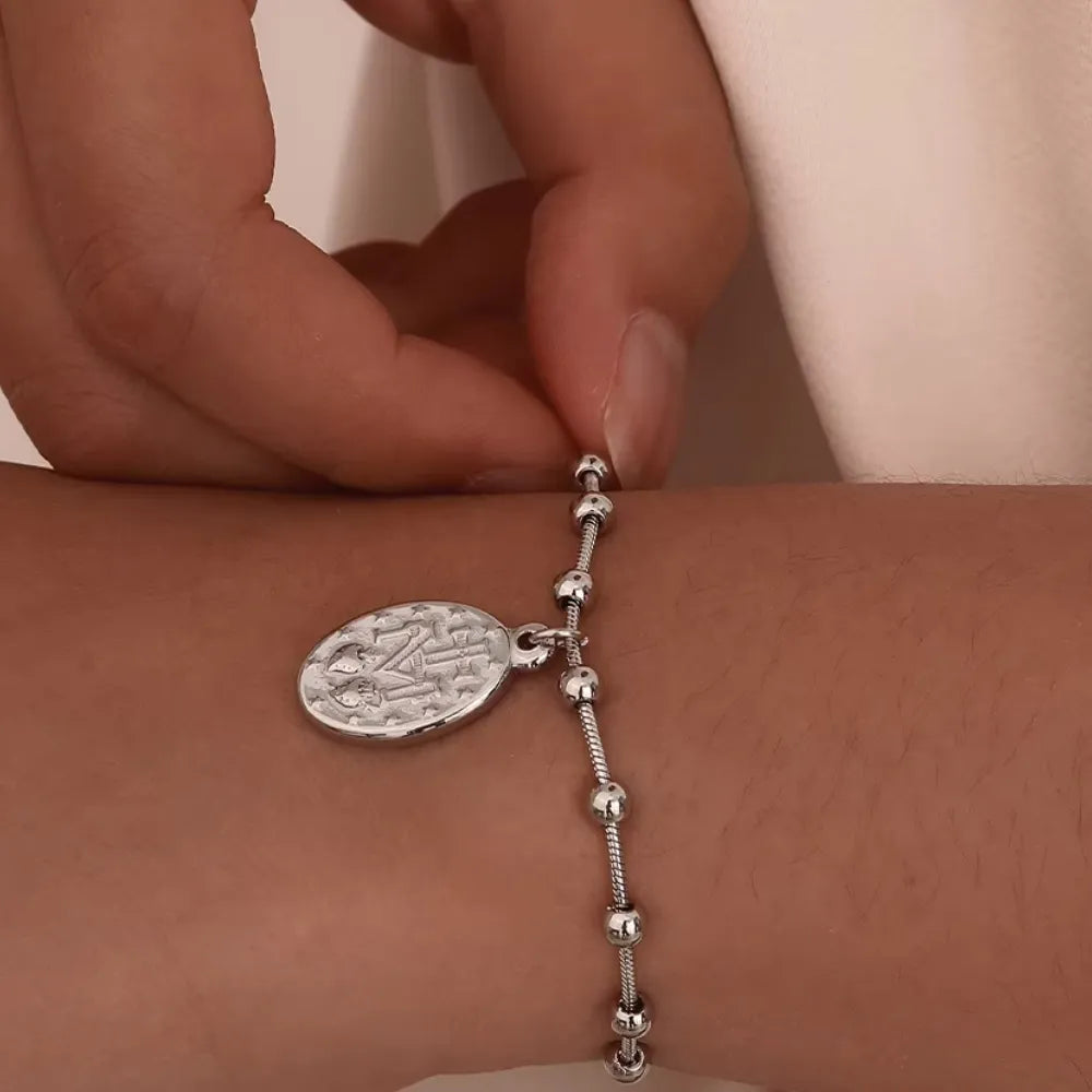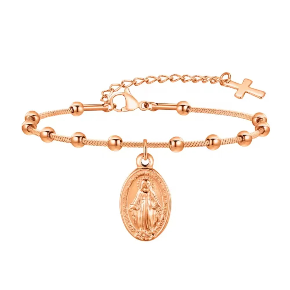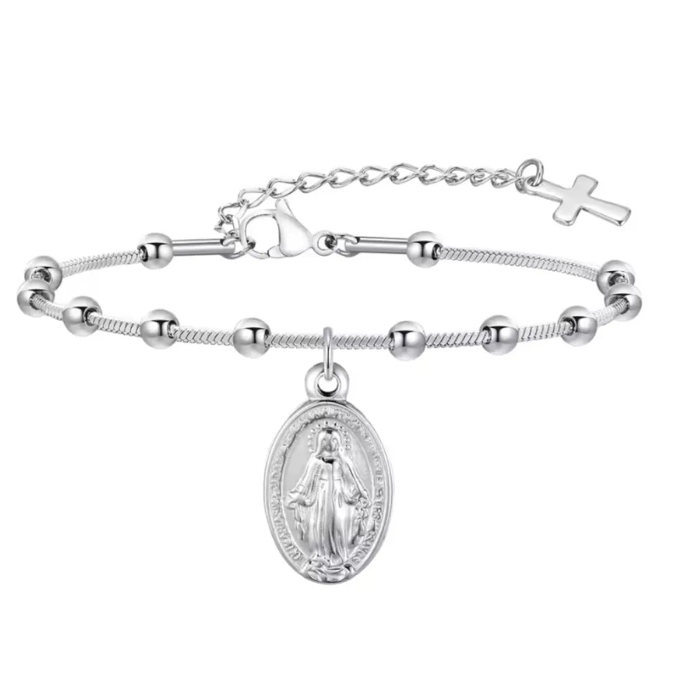 ▸ Design: Pulseira de oração com crucifixo e Virgem Maria